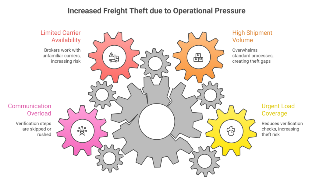 When brokers are managing high volumes or tight timelines, the focus often shifts toward speed over verification. This creates opportunities for fraudulent carriers or coordinated theft attempts (Transportation Intermediaries Association [TIA], n.d.).